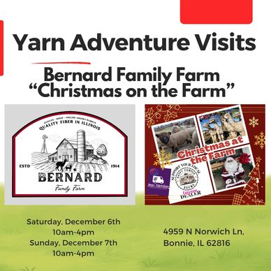 For the second year in a row, Yarn Adventure is visiting the famous Bernard Family "Christmas on the Farm" event. This two day holiday bonanza features shopping, getting to see (and even pet) adorable farm animals, and a festive holiday atmosphere. Come out to Bonnie, Illinois December 6th and 7th from 10am-4pm both days.