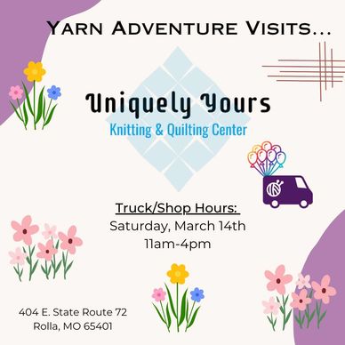 Yarn Adventure returns to visit Rolla, Missouri, at Uniquely Yours. We always have a great time visiting this fun shop, and we will be back on March 14th for a Saturday visit. Come out and see a fabulous local yarn shop, and visit the Yarn Adventure Truck from 11am-4pm.