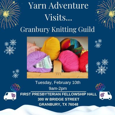 Yarn Adventure is returning to visit the Granbury Knitters Guild in Granbury, Texas on February 10th. We had a great time last year, and we are looking forward to seeing this fun group again. You can see the yarn truck setup from 9am-2pm behind the First Presbyterian Fellowship Hall. If you are interested, you can also talk to the guild about joining!