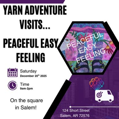 Yarn Adventure is making a trip to Salem, Arkansas to visit Peaceful Easy Feeling on the square on December 20th. Come out and see us in Katy's hometown, and support her friend Emma at Peaceful Easy feeling from 9am-2pm! It will be a great time to buy any last-minute Christmas gifts!
