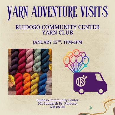 This year, on our trip to New Mexico, we are making a stop in Ruidoso, at the local community center. We will be set up for a meeting of the Ruidoso Community Center Yarn Club. We would love to see you there to shop our selection of hand-dyed yarns, notions, tools, and accessories from small-batch dyers and makers across the US. Come out and see us January 12th from 1pm-4pm!